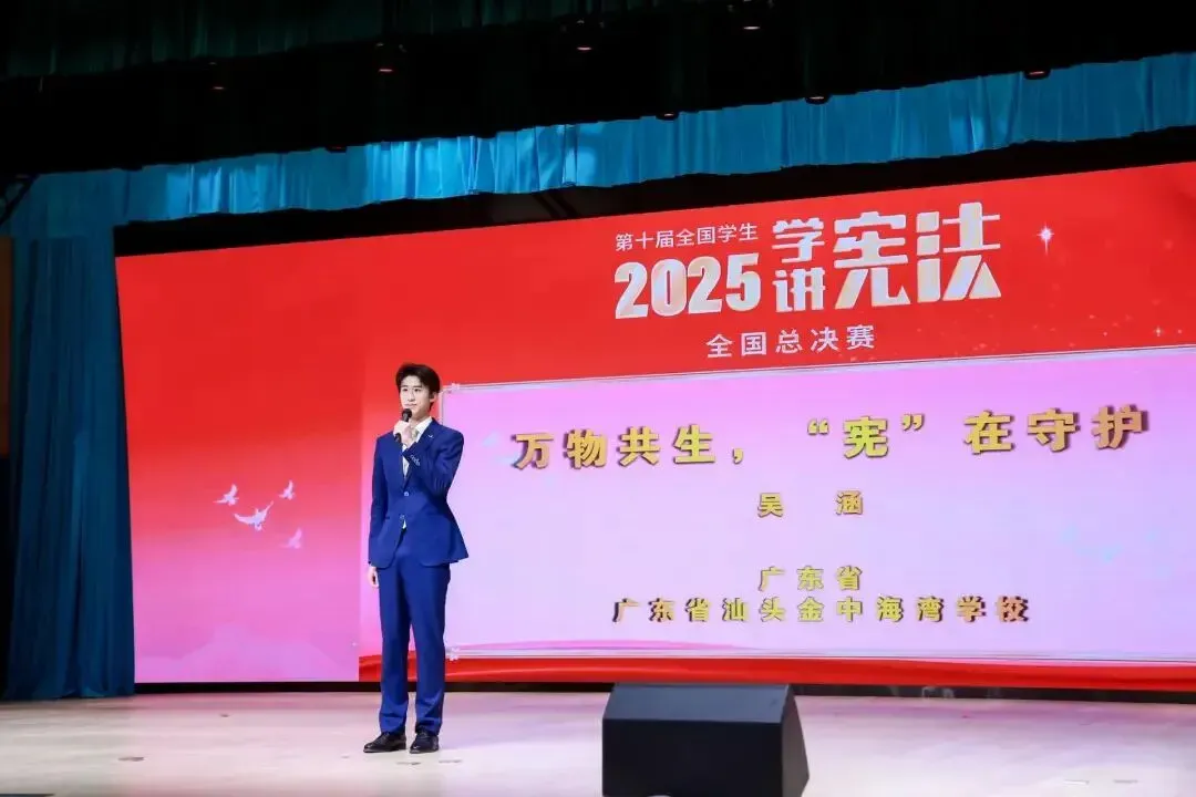 来自汕头金中海湾学校的吴涵同学,获得第十届全国学生“学宪法 讲宪法”演讲比赛高中组一等奖和最佳风采奖。是汕头首位受教育部邀请参加“宪法晨读”全国主会场优秀选手展演的学生,也是本届全国五位受邀优秀选手之一,广东省唯一受邀优秀学生代表。获得第四届广东法治文化节“崇法心声·交通安全靠大家”优秀普法小使者,第十届广东省学生“学宪法讲宪法”活动之演讲比赛暨粤港澳青少年法治演讲比赛高中组一等奖(冠军)。