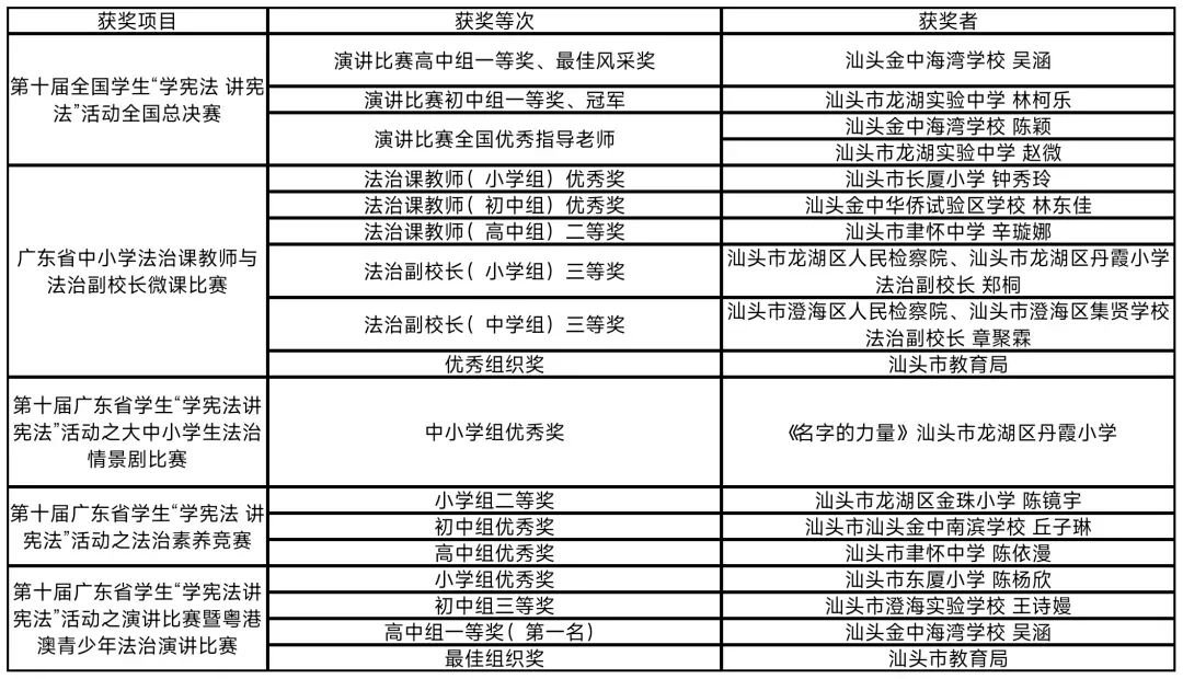 汕头市龙湖实验中学的林柯乐同学获得第十届全国学生“学宪法 讲宪法”演讲比赛初中组一等奖(冠军),是广东省唯一一位通过“网络风采展示”成功晋级全国总决赛的学生。