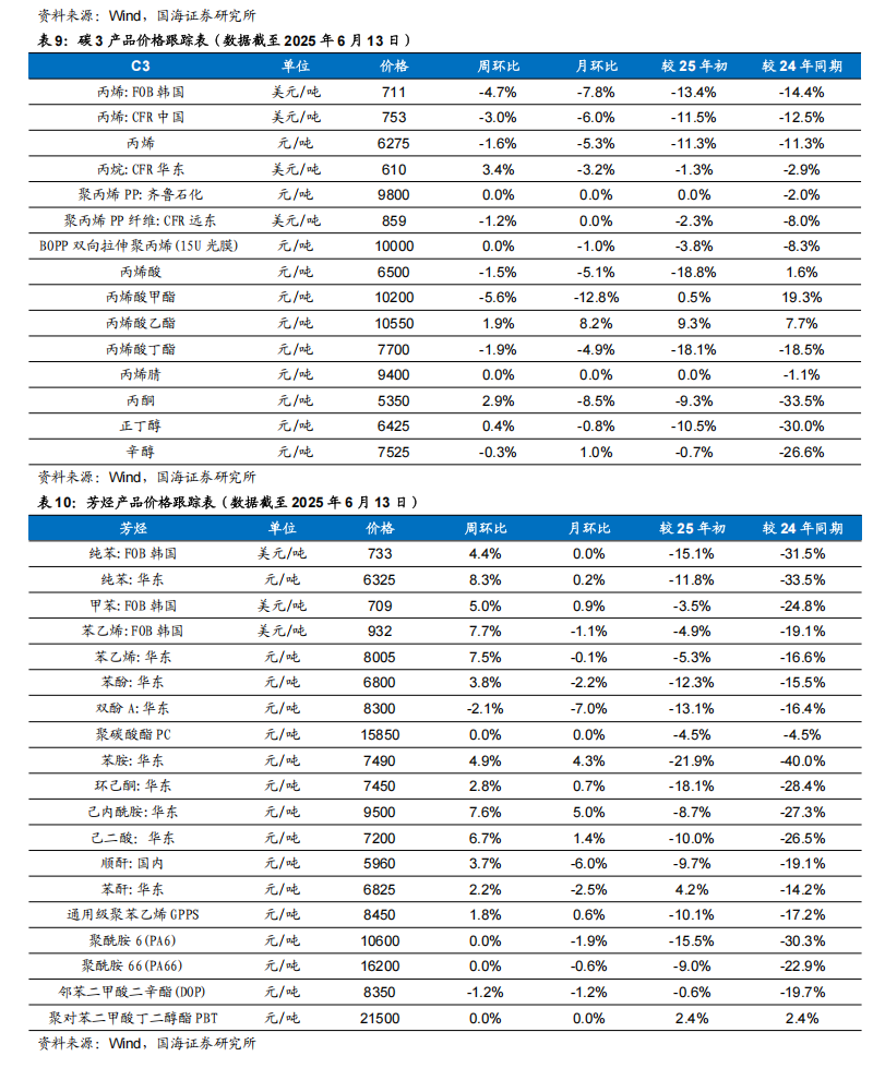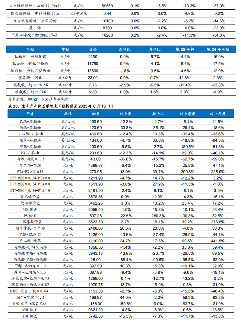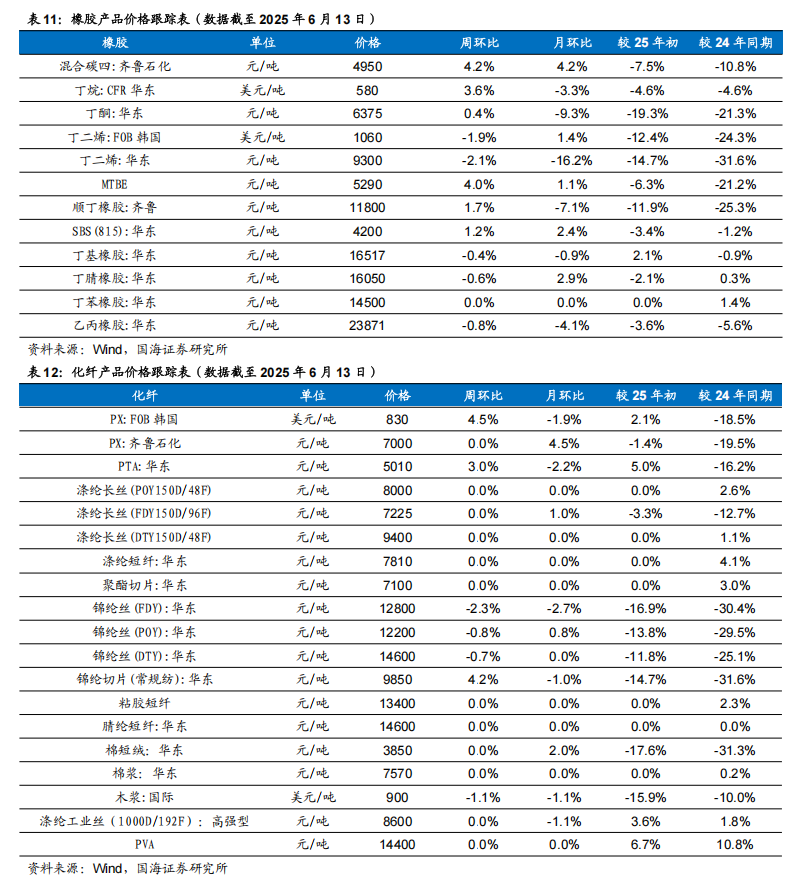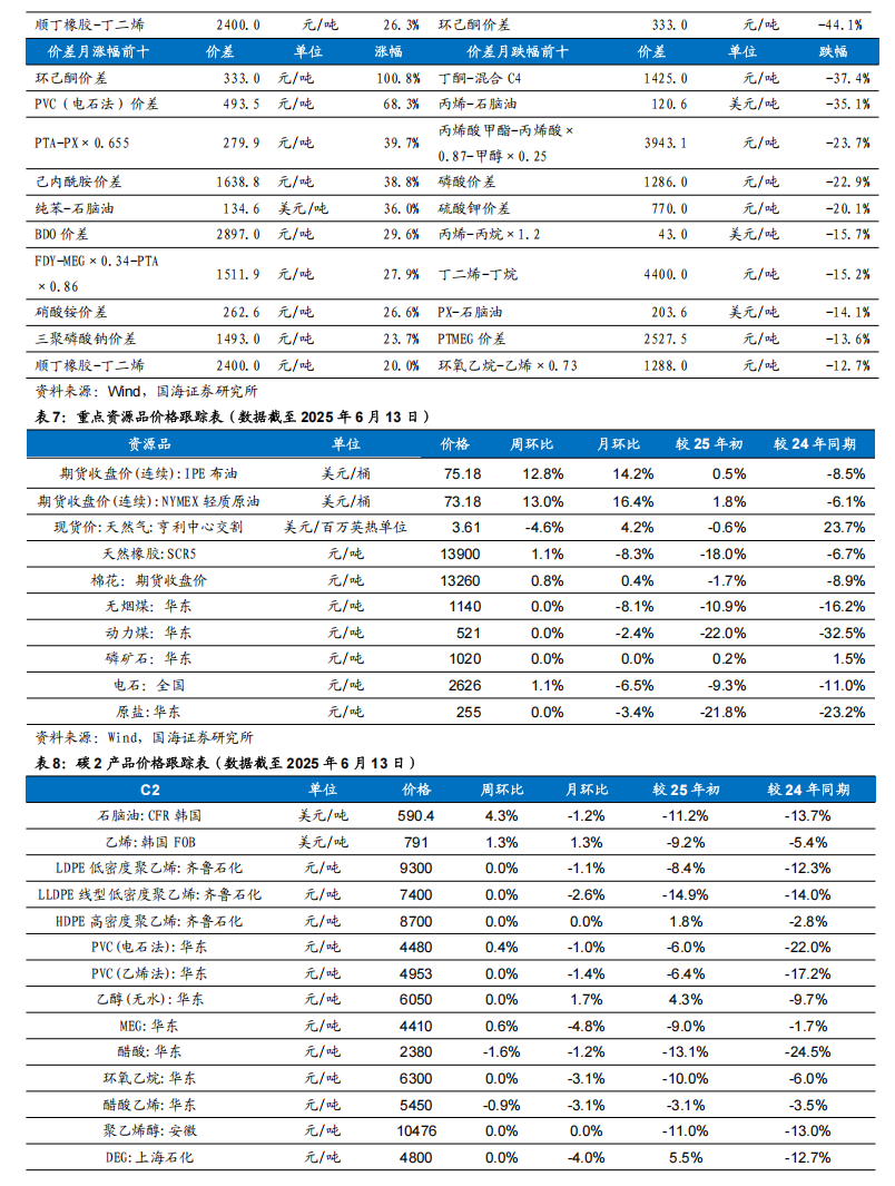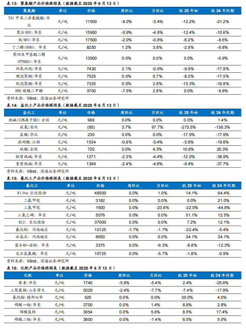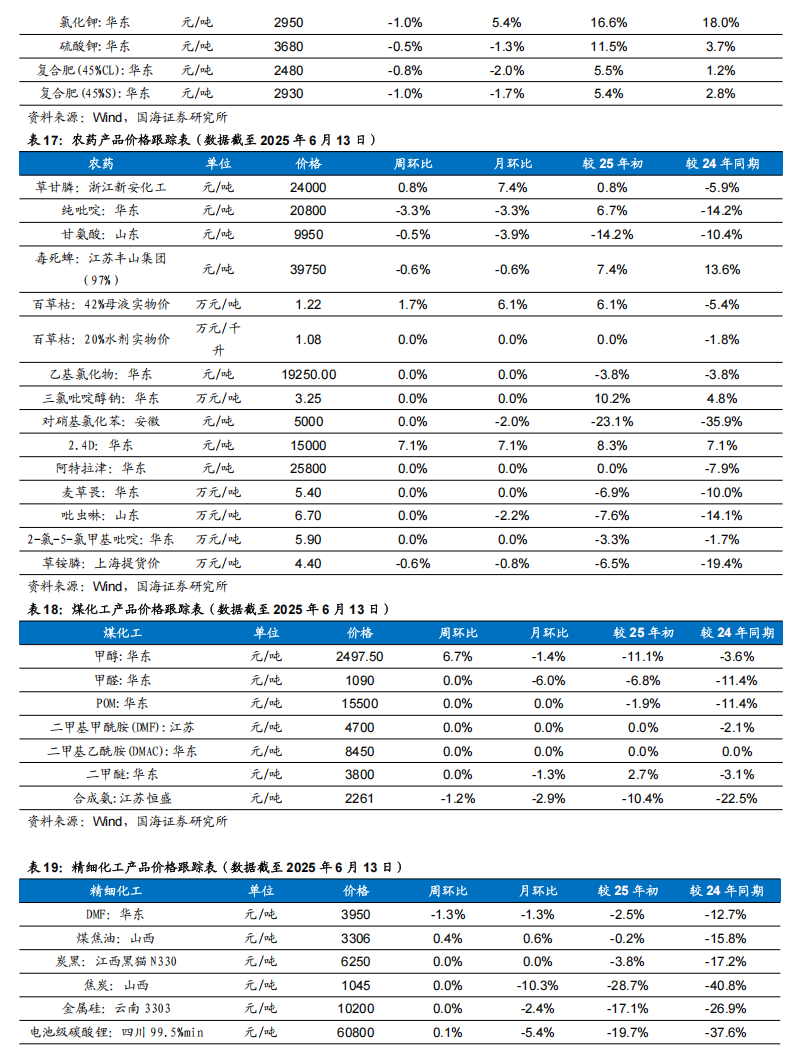 根据Wind,2025年6月12日顺酐价格为5950元/吨,环比6月6日上升50元/吨;据卓创资讯,2025年6月13日丁酮价格为6458元/吨,环比6月6日上升67元/吨。