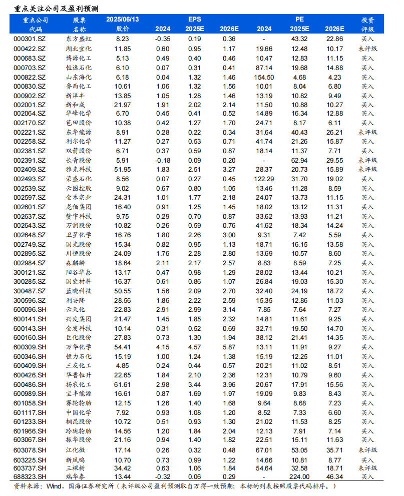 风险提示:宏观经济变化;油价震荡变化;环保趋严;产品价格大幅波动;重点关注公司业绩不达预期;中美财政政策不及预期;化工产品去库低于预期;AI数据中心建设和航空航天材料需求不及预期;全球经济增长的不确定性;磷矿石价格大幅下行等。