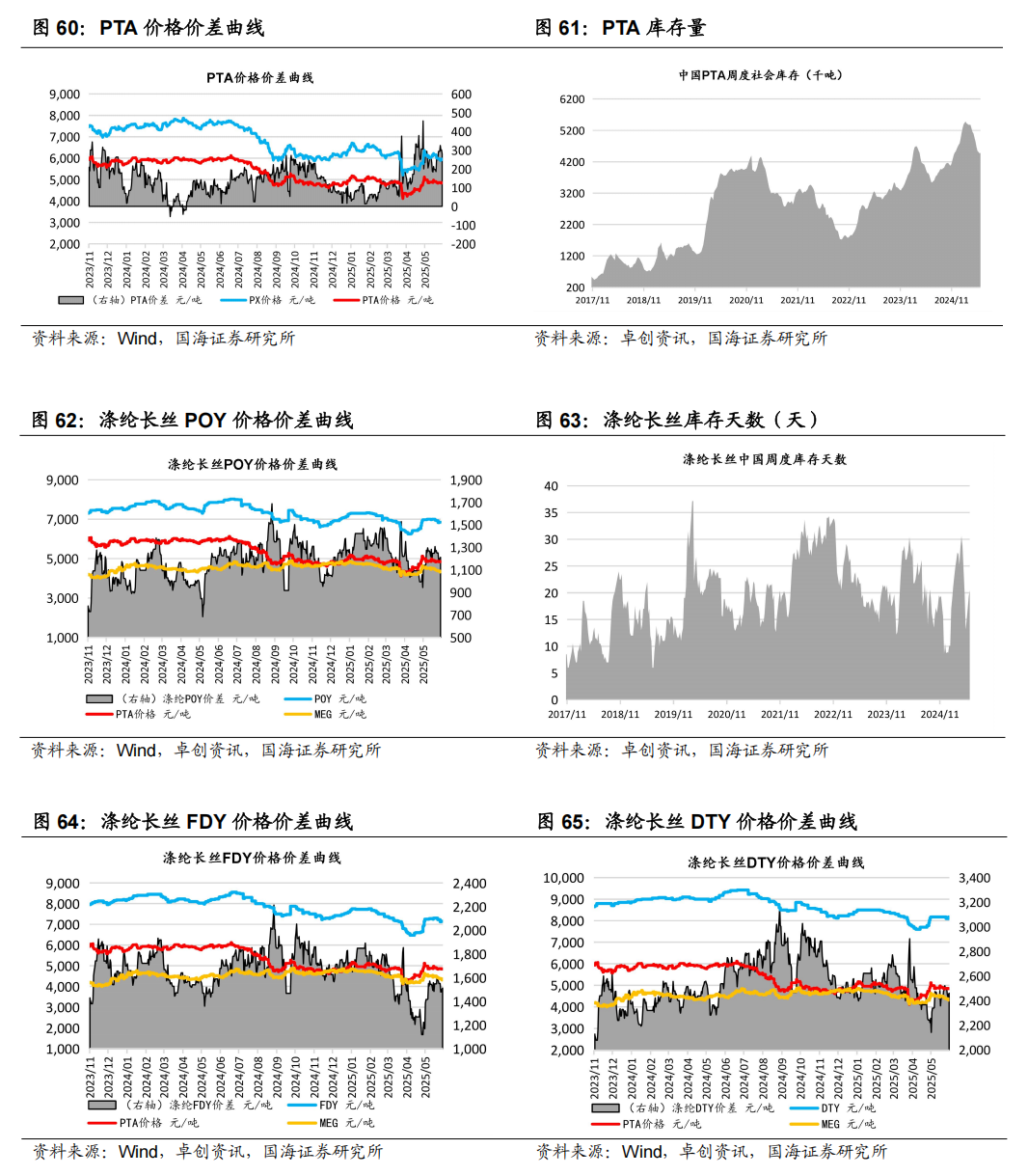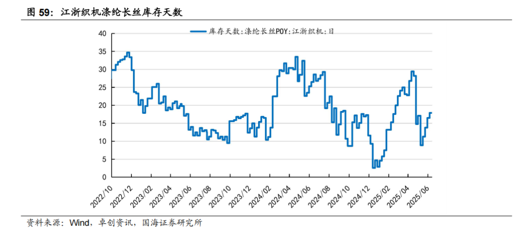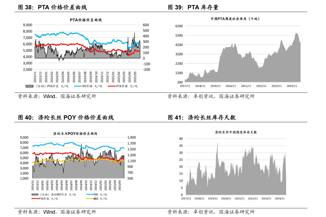据Wind和卓创资讯,2025年6月12日涤纶长丝库存天数为20.5天,较6月5日上涨1.2天。2025年6月13日PTA库存天数为448.2万吨,较6月6日增加1.3万吨。涤纶长丝POY价格为6900元/吨,较6月6日下降25元/吨。PTA价格为4990元/吨,较6月6日上涨120元/吨。