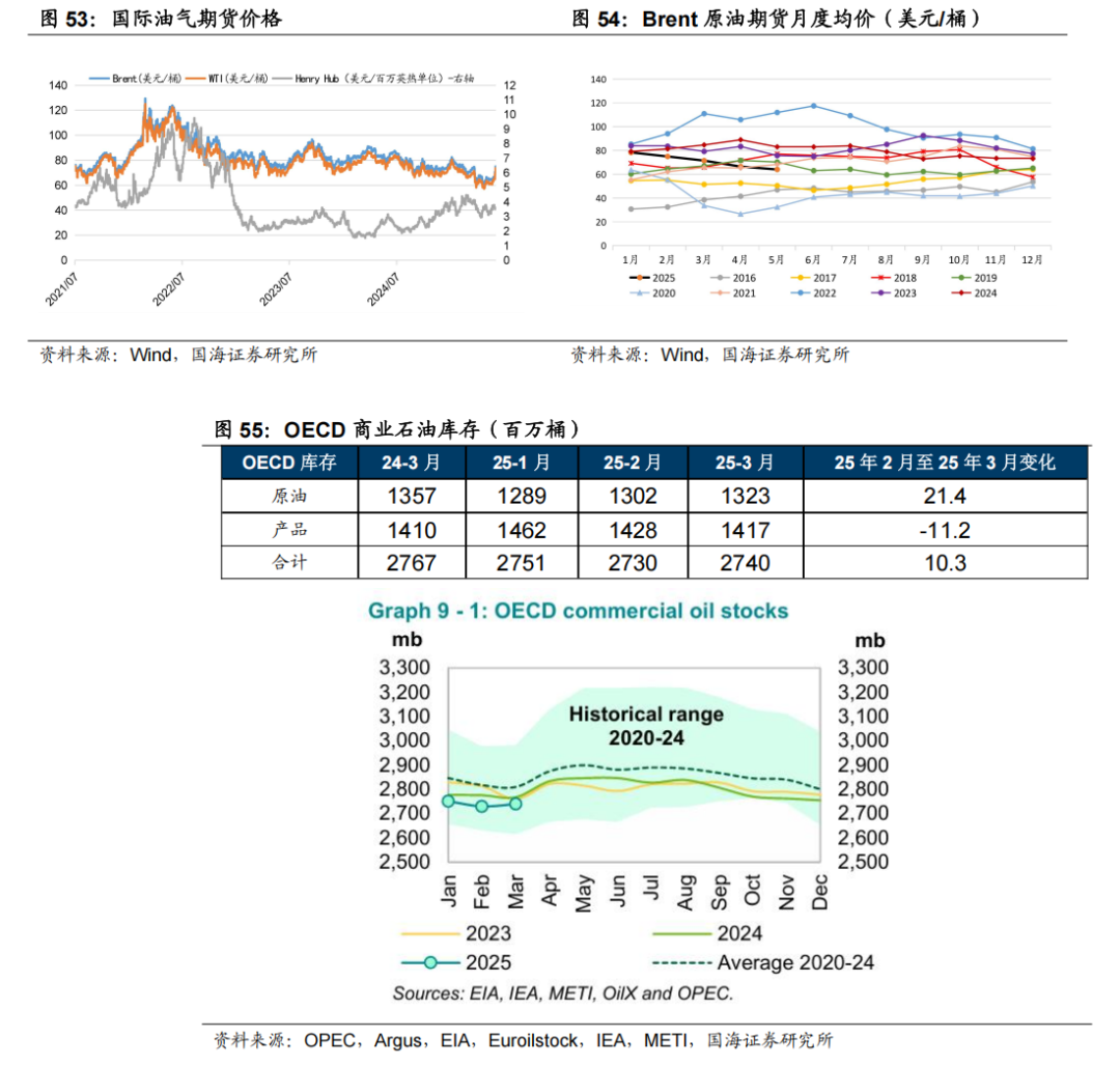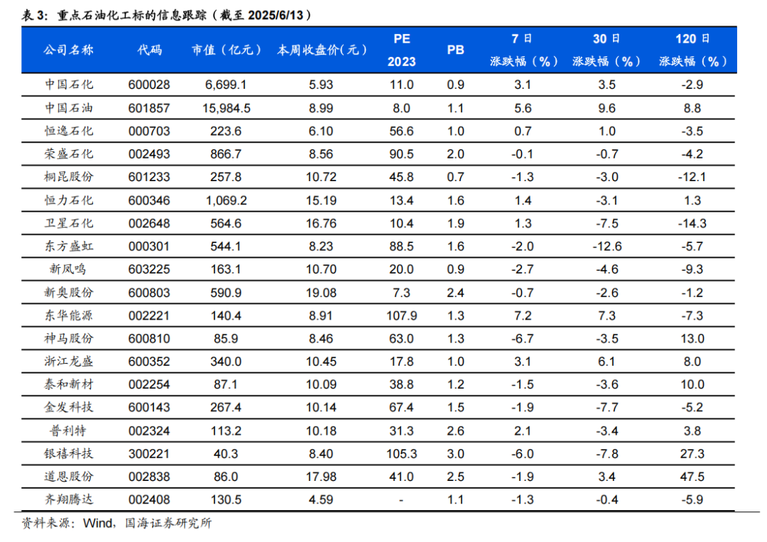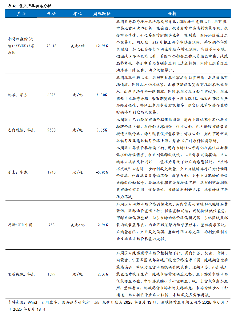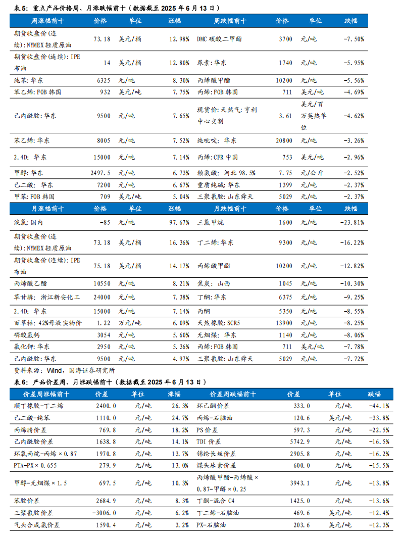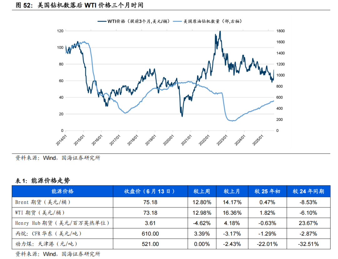 据Wind,截至2025年6月13日,Brent和WTI期货价格分别收于75.18和73.18美元/桶,周环比+12.8%和+12.98%。