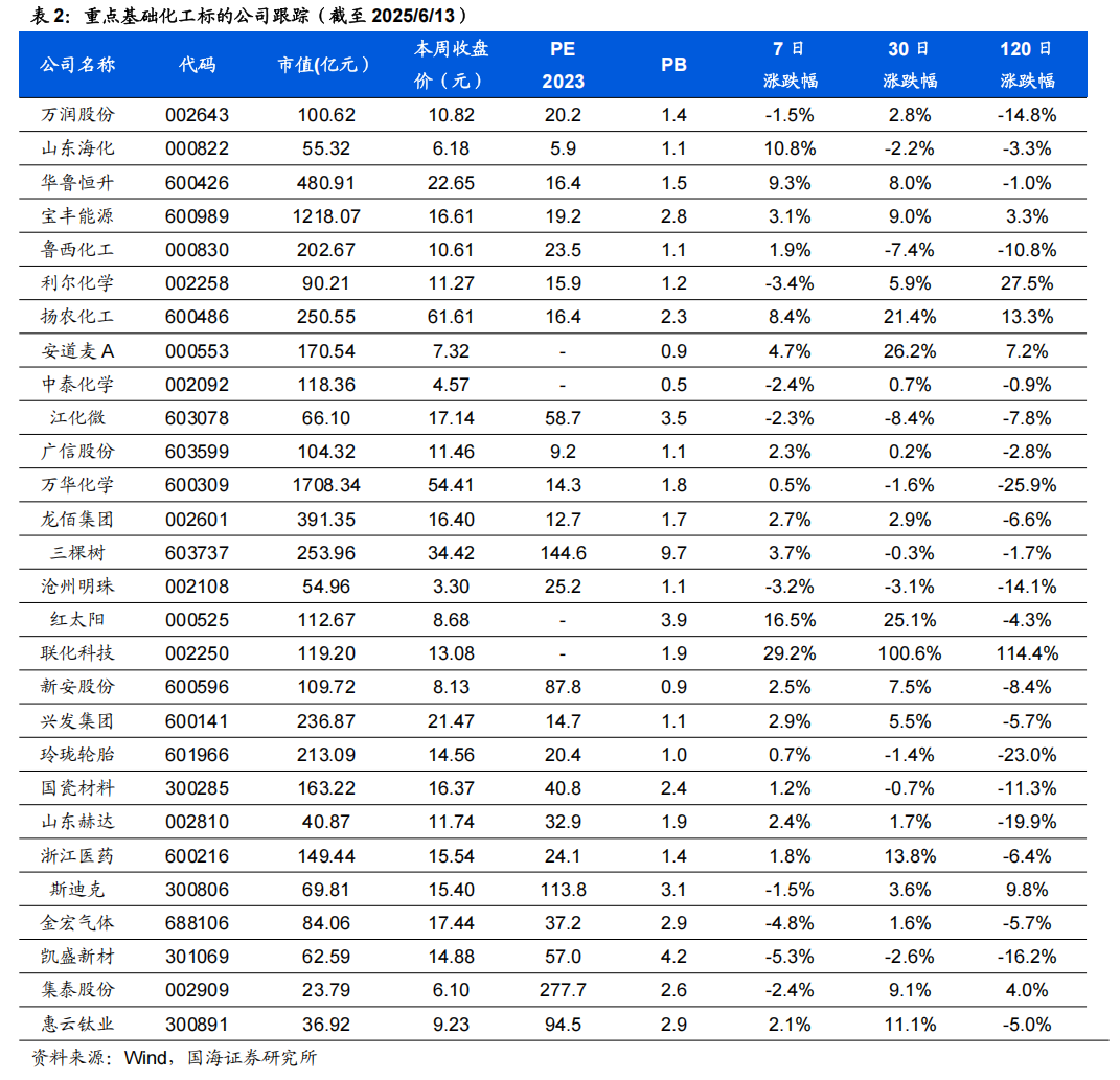本周(2025年6月7日-6月13日,下同)基础化工(中信)指数涨跌幅为0.2%,沪深300指数涨跌幅为-0.25%,基础化工跑赢沪深300指数0.45%。年初至今,基础化工指数涨跌幅为4.9%,沪深300指数涨跌幅为-1.8%,基础化工指数跑赢沪深300指数6.7%。