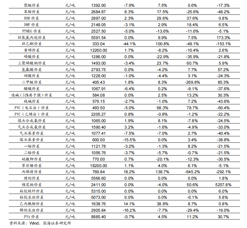 我们跟踪的171种产品的价格中,有52种上涨,占比30.41%,有44种产品下跌,占比25.73%。周涨幅前五的产品分别为:期货收盘价(连续):NYMEX轻质原油(12.98%)、期货收盘价(连续):IPE布油(12.8%)、纯苯:华东(8.3%)、苯乙烯:FOB韩国(7.75%)、己内酰胺:华东(7.65%)。周跌幅前五的产品分别为:DMC碳酸二甲酯(-7.5%)、尿素:华东(-5.95%)、丙烯酸甲酯(-5.56%)、丙烯:FOB韩国(-4.69%)、现货价:天然气:亨利中心交割(-4.62%)。